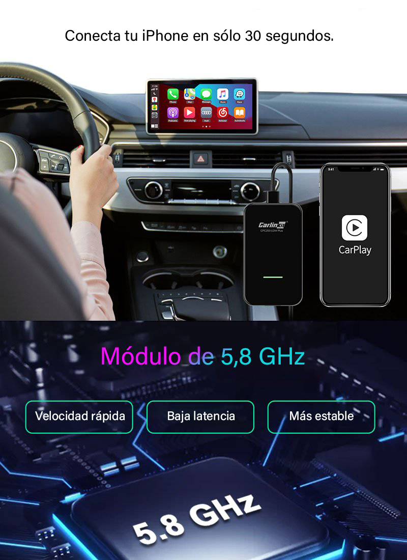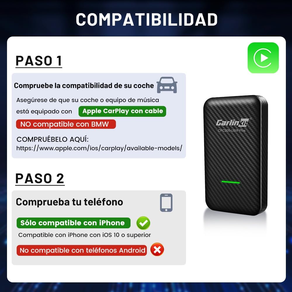 - Dispositivos compatibles: Su Coche Debe Tener Incorporado De Fábrica CarPlay Con Cable. El adaptador inalámbrico Carlinkit 3.0 funciona con todos los iPhone, desde el 5 (con IOS 7.1) hasta el 12 Pro MAX. (¿Cuánto tarda en conectarse la unidad Carlinkit? Depende de su teléfono y de su coche, pero suele tardar entre 7 y 14 segundos).